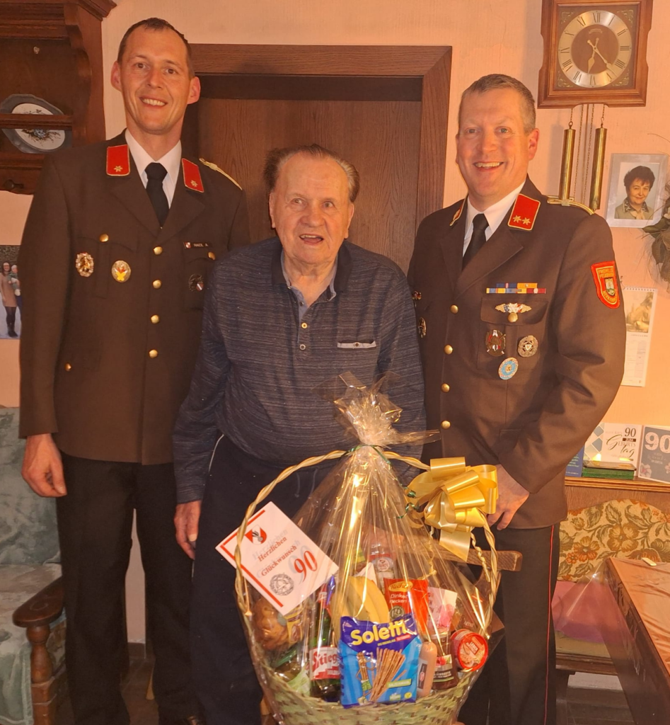 Anlässlich seines 90. Geburtstags überreichte das Kommando der FF Merkenbrechts Ehrenkommandant Gottfried Nussbaum sen. einen Geschenkkorb.